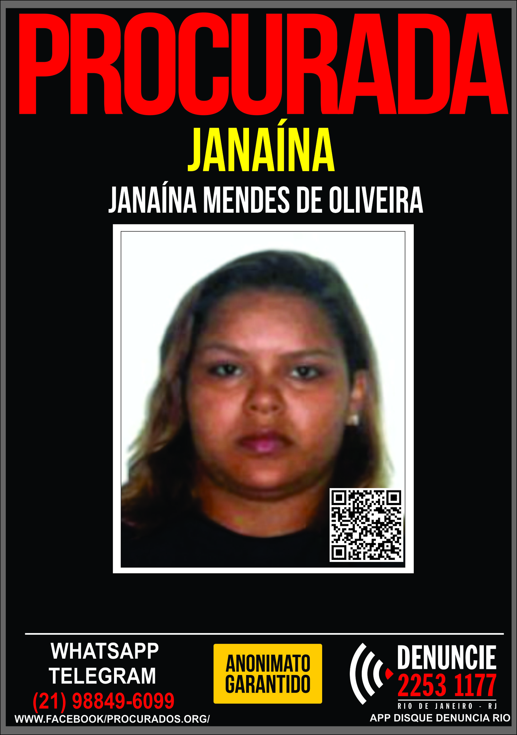 Janaína Mendes de Oliveira é procurada pelos crimes de Associação para a Produção e Tráfico e Condutas Afins (Art. 35 - Lei 11.343/06); Tráfico de Drogas e Condutas Afins (Art. 33 - Lei 11.343/06); Aumento de Pena Por Tráfico Ilícito de Drogas (Art. 40 - Lei 11.343/2006), III e IV; Falsidade ideológica (Art. 299 - CP); Corrupção ativa (Art. 333 - CP); Concurso de Pessoas (Arts. 29 a 31 - Cp), 29; "Lavagem" Ou Ocultação de Bens, Direitos Ou Valores Oriundos de Corrupção (Art. 1º, V - Lei 9613/98), § 1º e § 4º; Colaborar C/ Grupo,organização,associação: Destinados À Produção/tráfico Drogas- L.11.343/06, Art.37; Quadrilha ou Bando (Art. 288 - CP), § único; Concurso Material (Art. 69 - Cp).