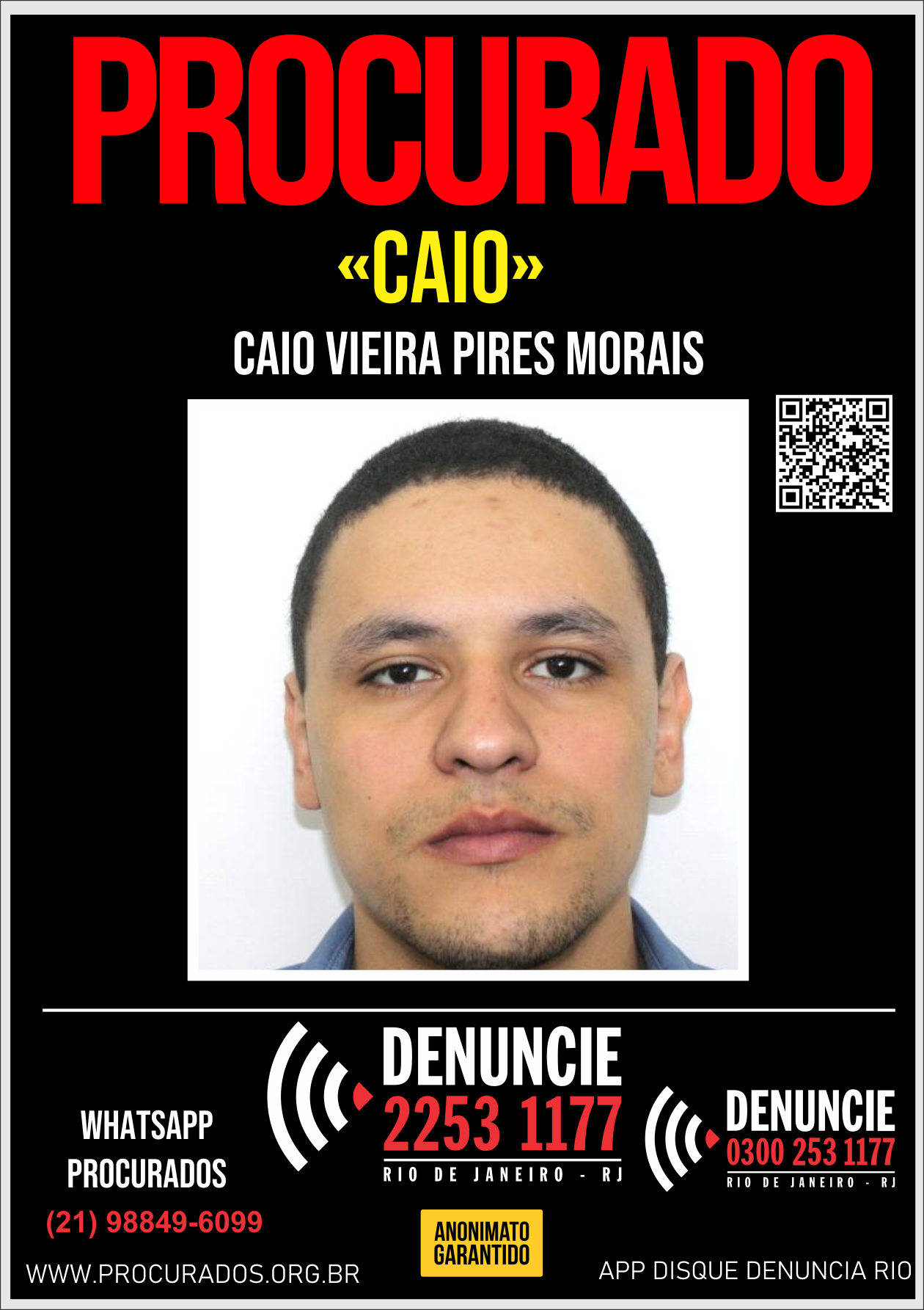 Caio Vieira Pires de Morais é procurado pelo crime de Homicídio Qualificado (Art. 121, § 2º), praticado no carnaval de 2019, em São João da Barra, município do Norte Fluminense, no estado do Rio de Janeiro.