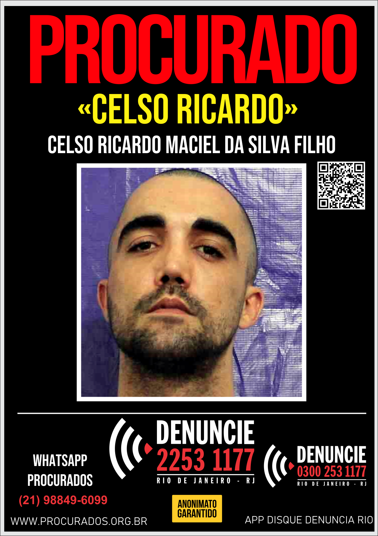 Celso Ricardo Maciel da Silva Filho é procurado pelo crime de Homicídio Qualificado (Art. 121, § 2º), praticado no carnaval de 2019, em São João da Barra, município da mesorregião do Norte Fluminense, no estado do Rio de Janeiro.