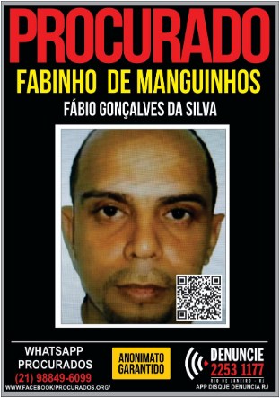 Portal dos Procurados divulga cartaz para ajudar a 21ª DP ? Bonsucesso e Ministério Público do Rio de Janeiro ? MPRJ, com informações que possam levar recaptura do traficante Fábio Gonçalves da Silva, o Fabinho Bernard, de 43 anos. Ele é considerado um dos líderes do tráfico de drogas das Favelas de Manguinhos e do Jacarezinho, em Manguinhos, Zona Norte do Rio de Janeiro. Ligado a facção Comando Vermelho atualmente, ele é considerado foragido da Justiça e contra ele consta um mandado de prisão pendente de cumprimento.