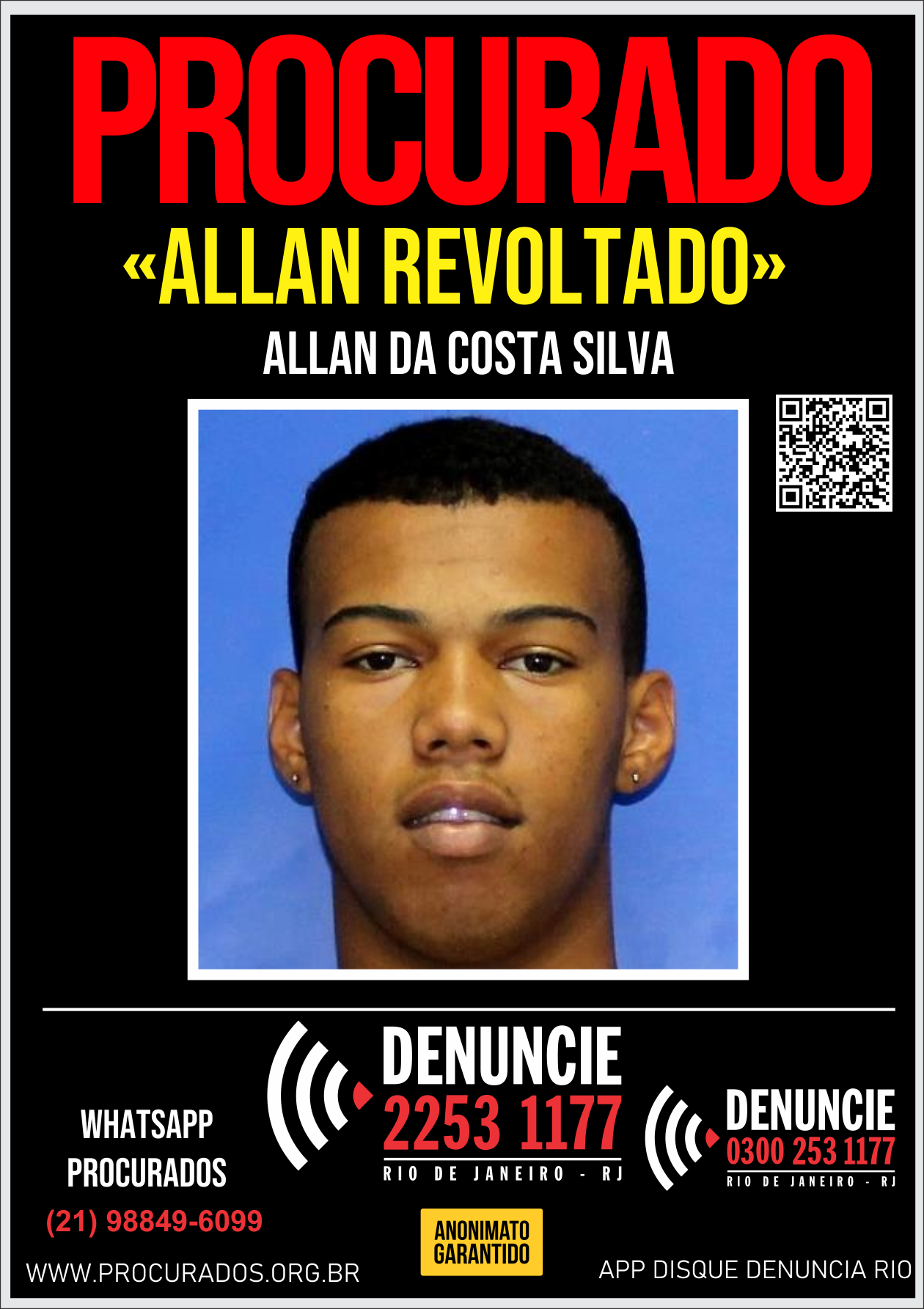 Allan da Costa Silva, o Allan Revoltado, é integrante de um grupo de roubos de cargas e veículos na região de Pilares e Piedade, Zona Norte do Rio. Ele pertence ao tráfico de drogas que age no Morro do Urubu. Ele é procurado pelo crime de Homicídio Qualificado (Art. 121, § 2º - Cp).