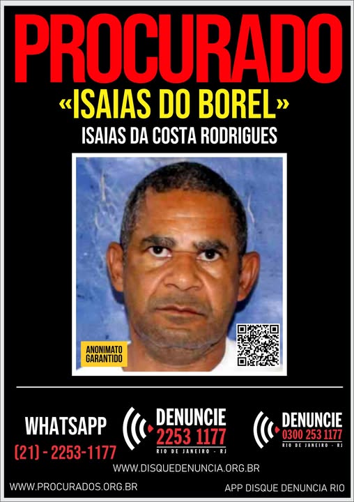 ISAIAS DA COSTA RODRIGUES, mais conhecido como "Isaias do Borel", de 49 anos, considerado de Altíssima Periculosidade, está na condição de procurado pela Justiça do Rio.